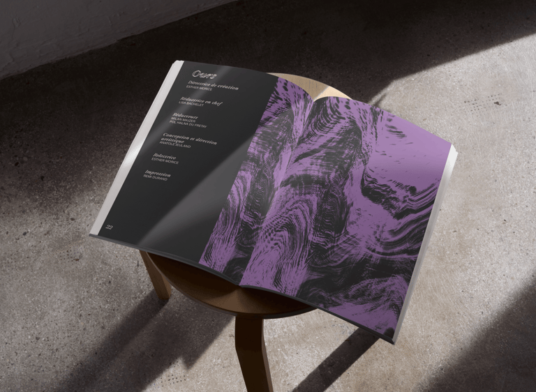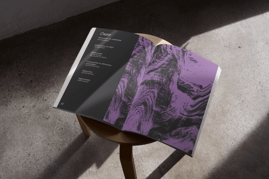 Ici les différents blocs de textes ont été traités et mis en page de manière à en faire des éléments visuels à part entière. Et ce dans l'idée de travailler un rapport texte/image d'égal à égal. De plus, les photographies ont été traitées de manière à retranscrire l’énergie du lieu et de l’événement, aussi bien dans les couleurs que dans la texture.