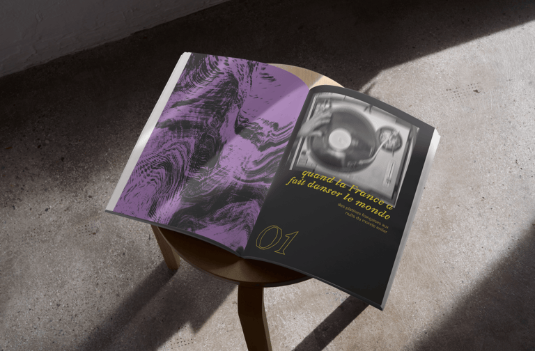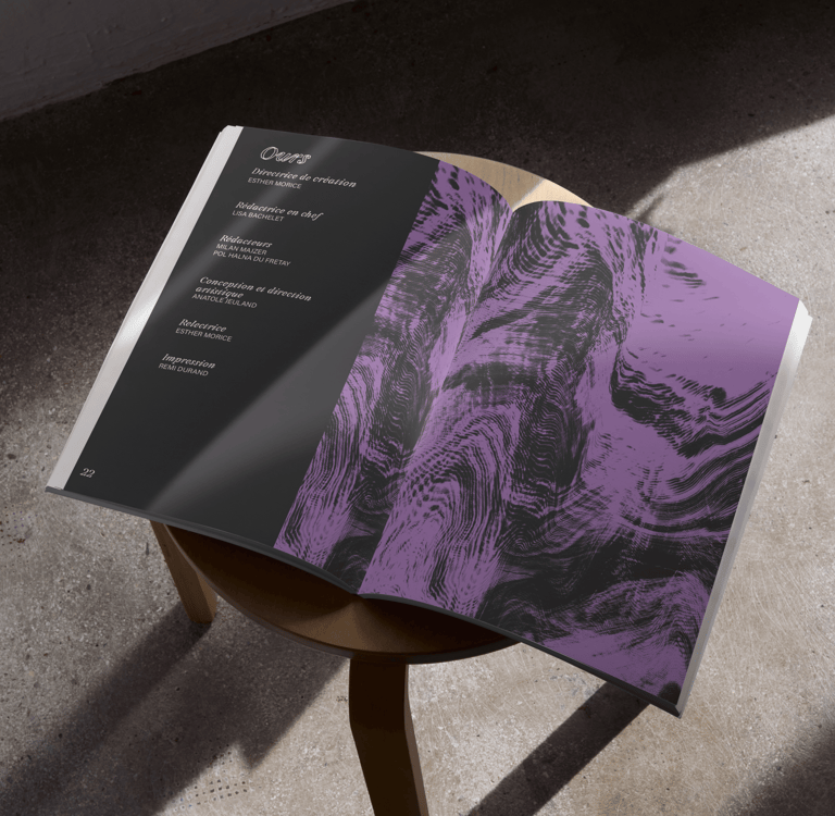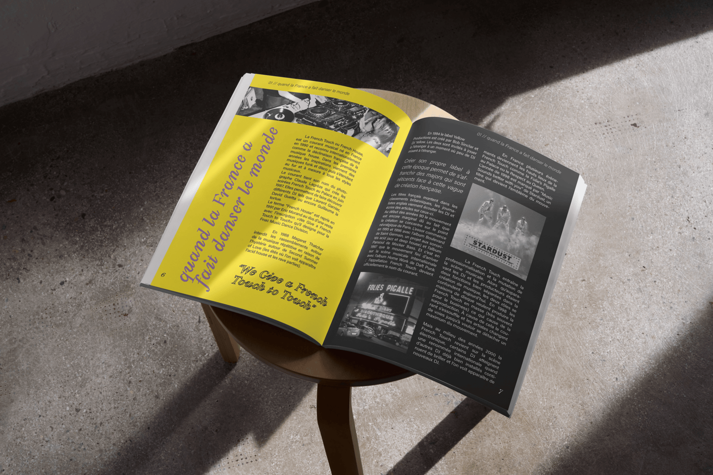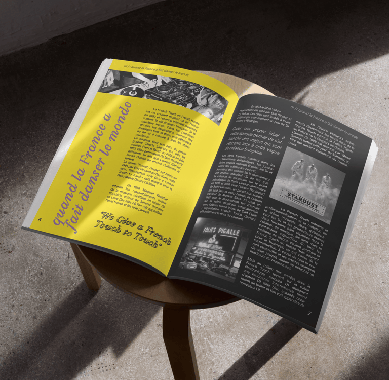 L'idée ici a été de travailler avec des couleurs qui ne me sont pas habituelles, de créer un mise en page attrayant afin de conserver l'attention du lecteur et de retranscrire l'idée du mouvement sonore à travers le traitement de certaines photos.
