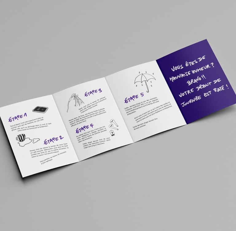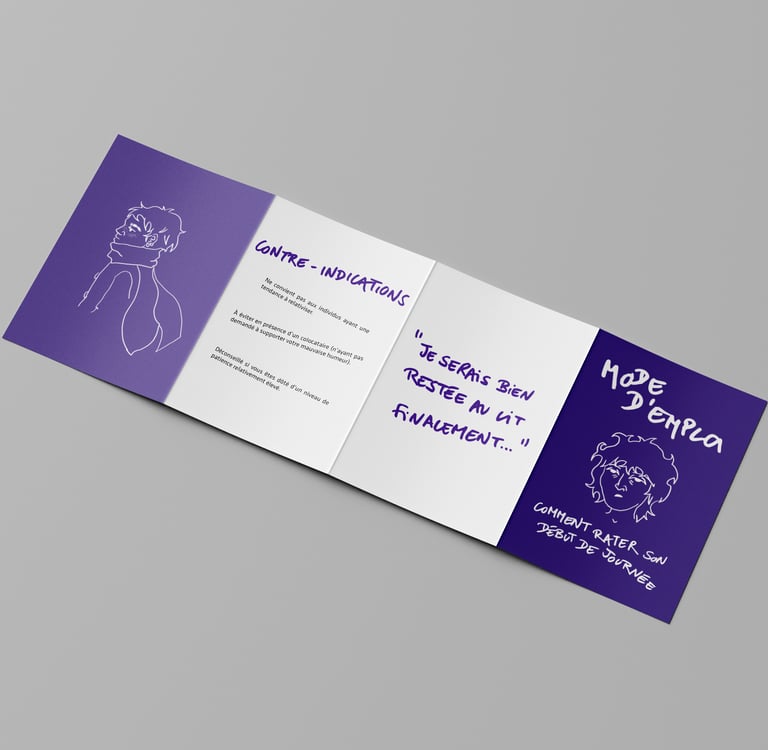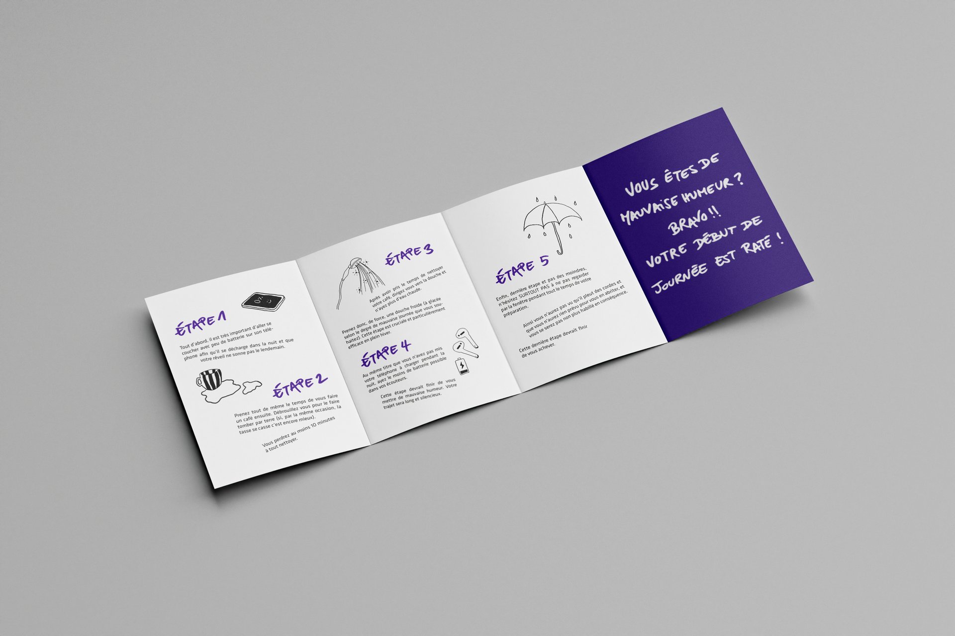 Conception d'un dépliant à caractère pratique et informatif. Ce mode d'emploi a été réalisé sur un ton humoristique en détaillant les différentes étapes de comment rater son début de journée.