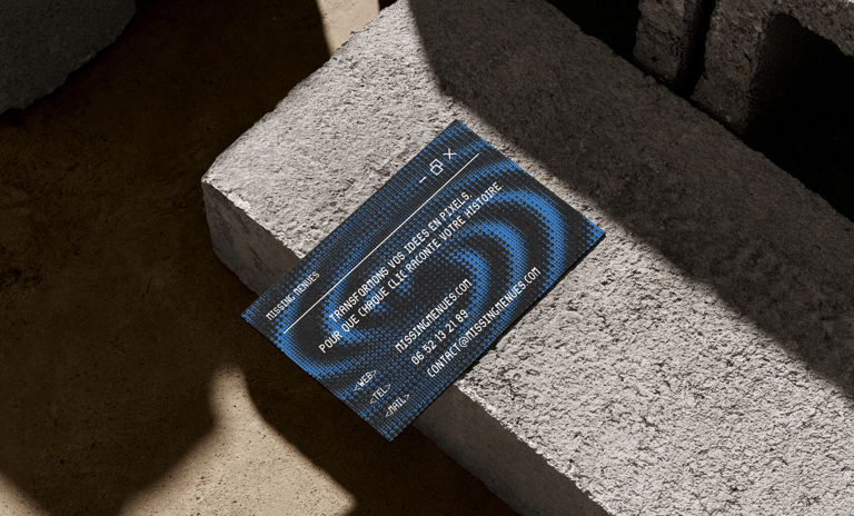 Création des éléments graphiques de la carte de visite réalisés via Dither Boy (logiciel de tramage) puis retravaillés sur Photoshop ; mise en page sur Indesign