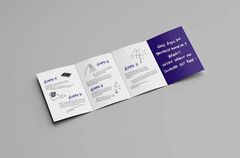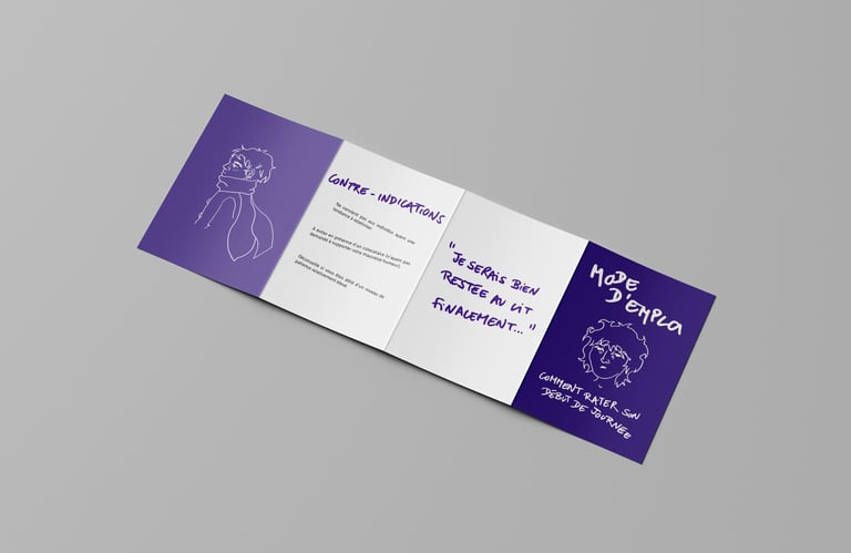 L'idée pour ce dépliant a été de travailler le violet, une couleur avec laquelle je n'ai pas l'habitude de travailler et qui, selon moi, correspondait bien au sujet de ce mode d'emploi. J'ai également voulu réaliser un projet intégrant des illustrations.